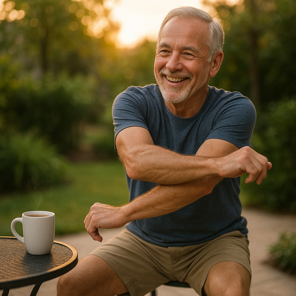 Even before the day starts, I get a jump on it. While I’m waiting for my coffee to brew, I take a couple of minutes to engage every joint and muscle group by simply moving in place — gentle twists, arm circles, squats, shoulder rolls. It’s fast, efficient, and surprisingly effective. By the time the coffee’s ready, so am I.