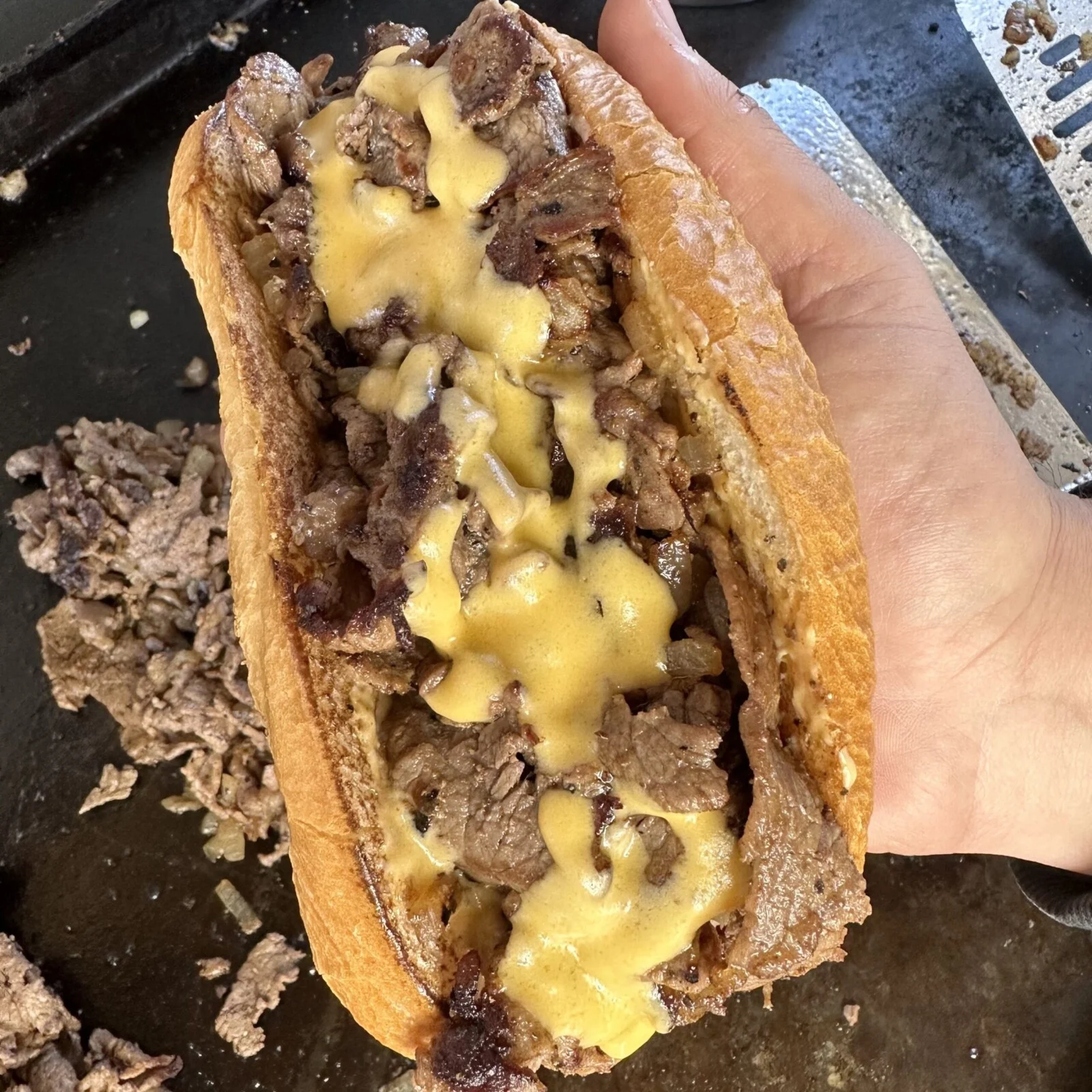Eventually I park somewhere near the next township, walk in, and the grill guy is workin’ the flat-top like it owes him money. Onions sizzlin’, cheese melting, rolls flyin’ open — the whole place smellin’ better than scrapple fryin’ on a Sunday morning.